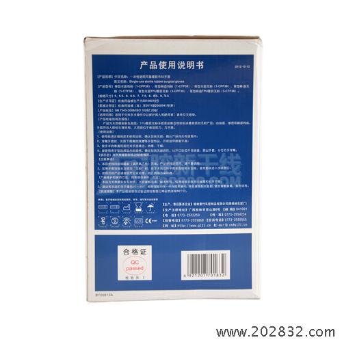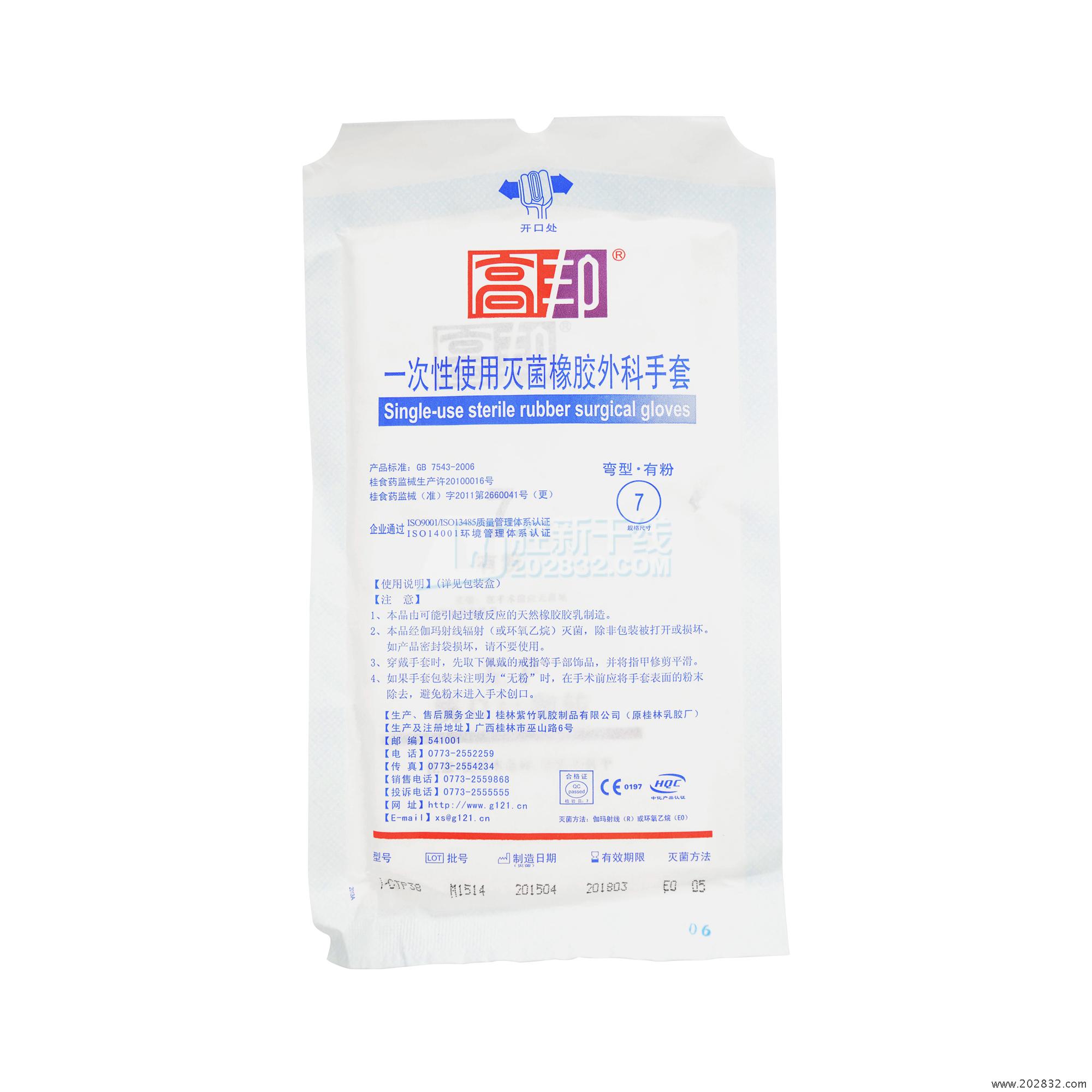 | 生产企业名称: | 桂林紫竹乳胶制品有限公司 | 产品标准: | GB7543-2006《一次性使用灭菌橡胶外科手套》 |