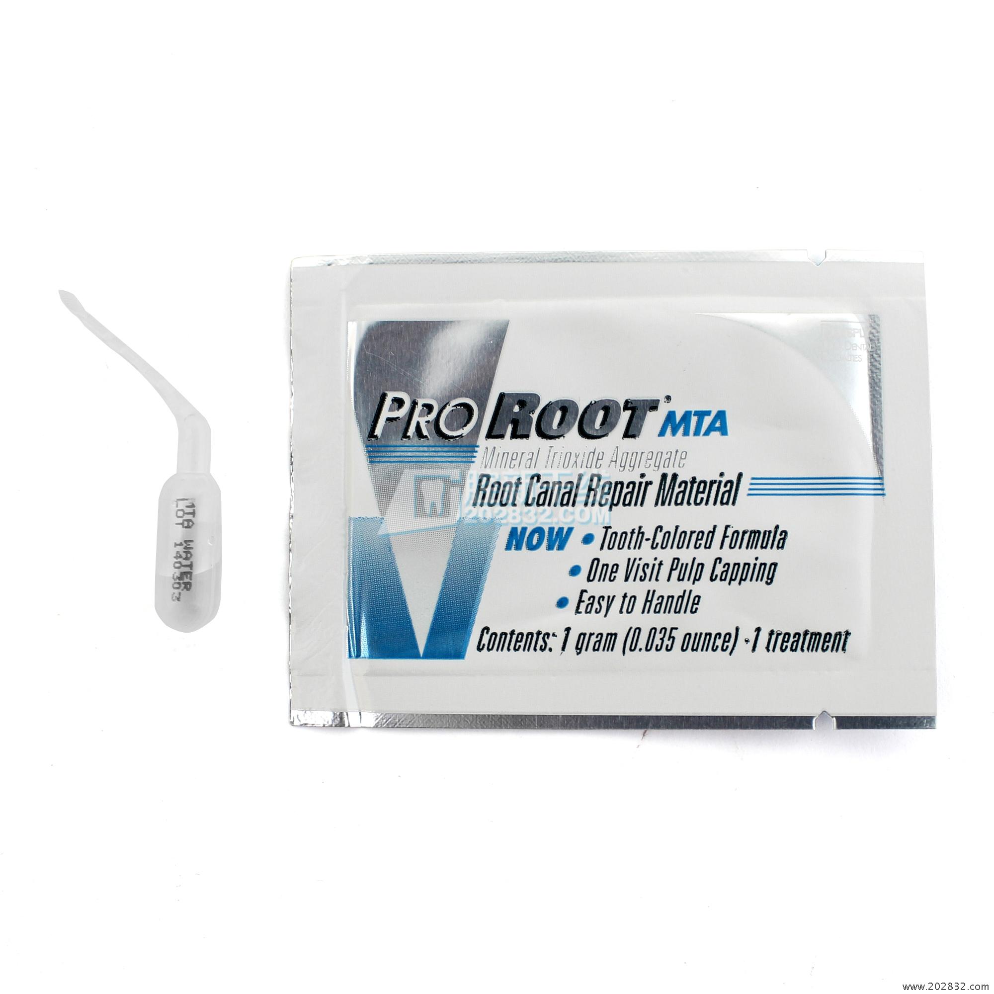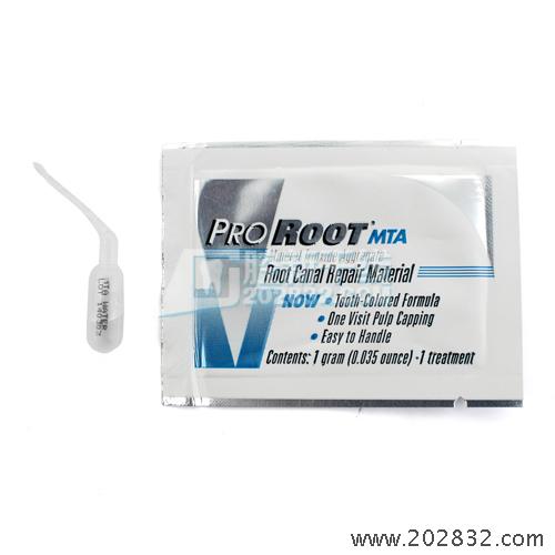 1.ProRoot MTA 根管修复材料是由细亲水颗粒构成的粉末,能够在有水的情况下凝结。这种粉末水合后能生成胶态凝胶,凝固后形成一道坚固的防水屏障,在四周的时间内完全固化。