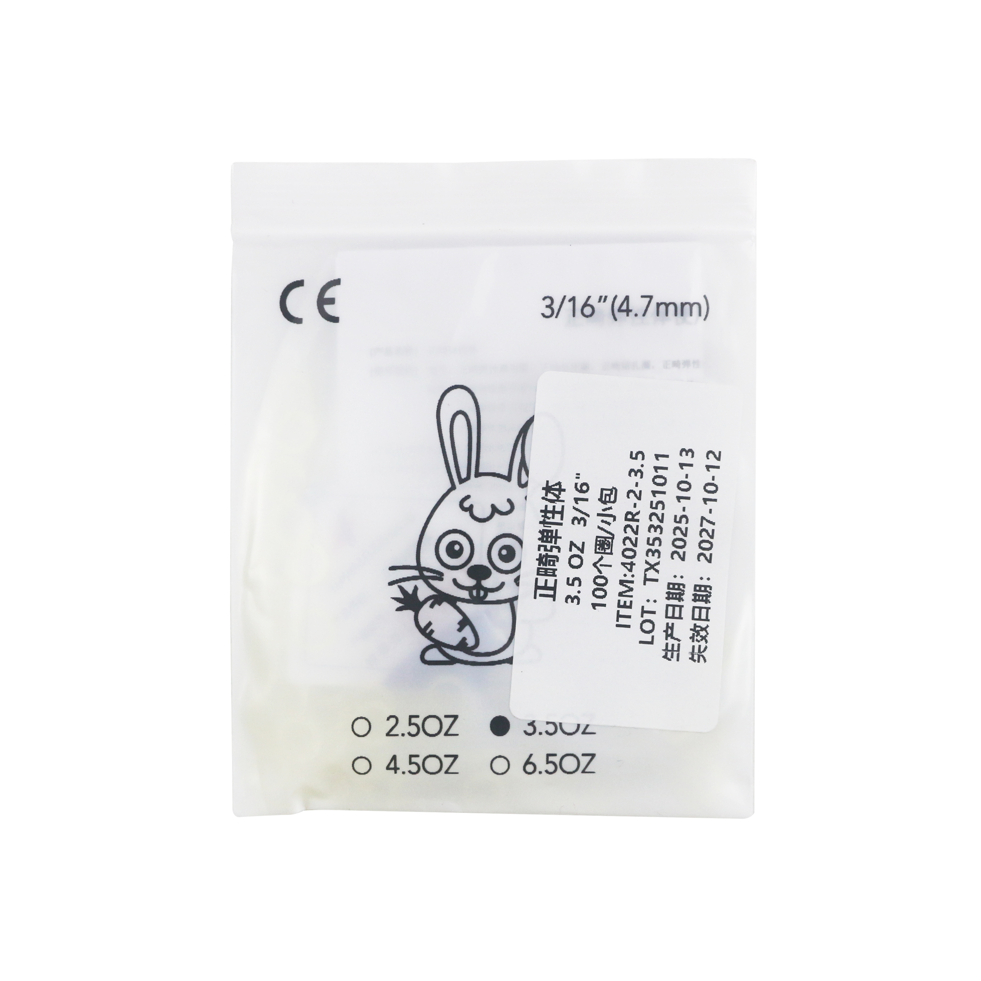 | 产品名称: | 橡皮牵引圈(乳胶) 正畸橡皮圈 3.5OZ,3/16",100个/袋 | 商品编号: | 333-XPQ4022R-2-3.5 |