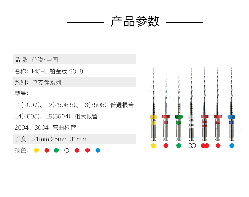 产品名称: 益锐/M3 机用根管锉 M3-L-2007/2506.5/3506-21(21mm 3支/板混装) 商品编号: M310000R5-JX