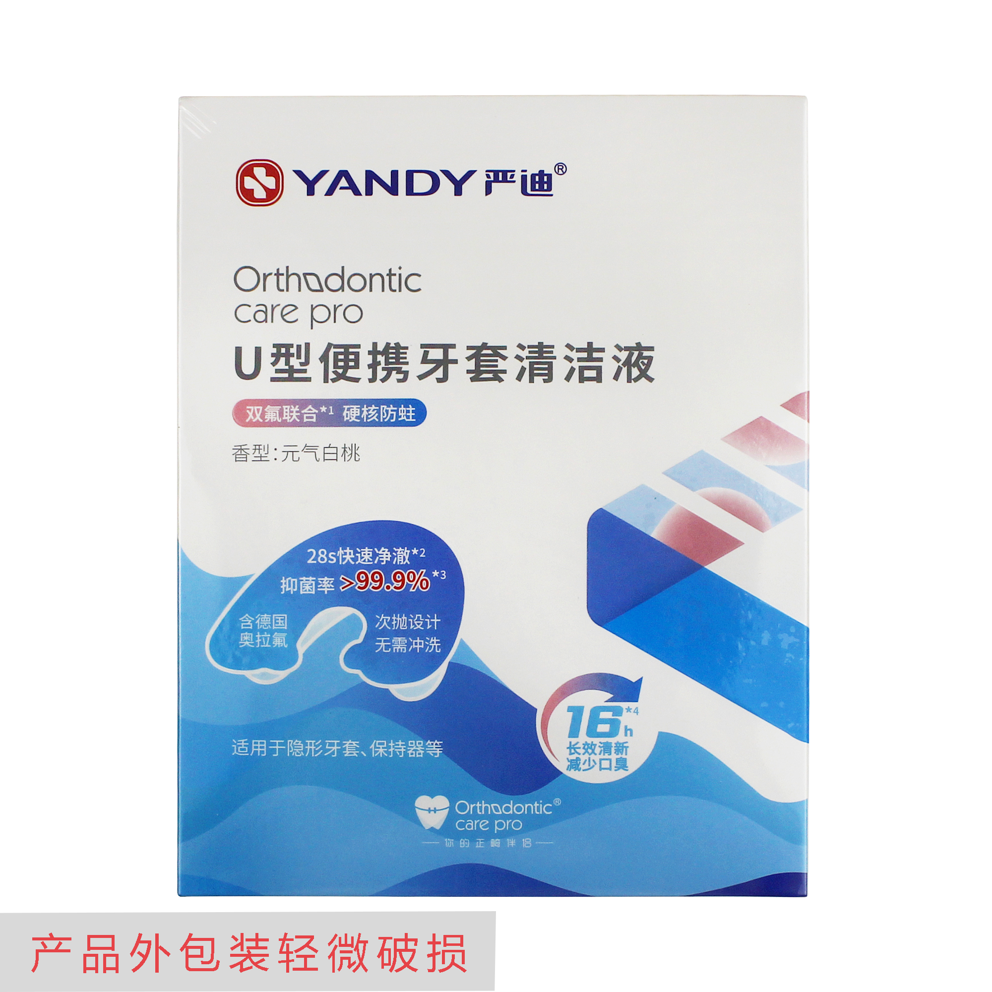 特价 严迪/YANDY U型 便携牙套清洁液 正畸专用 元气白桃香 300ml(30ml/只10只/盒)(产品外包装轻微破损)
