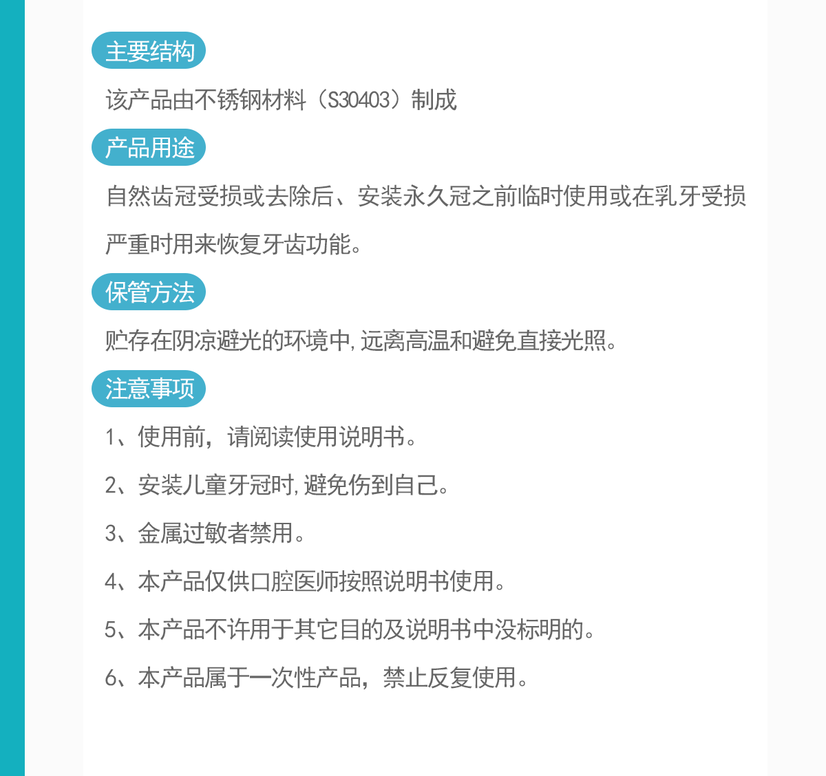 是否需要医疗机构资质: | 是 | 适用范围: | 该产品适用于自然齿冠受损或去除后、安永久齿冠之前临时使用或在乳牙受损严重时用来恢复牙齿功能。 |