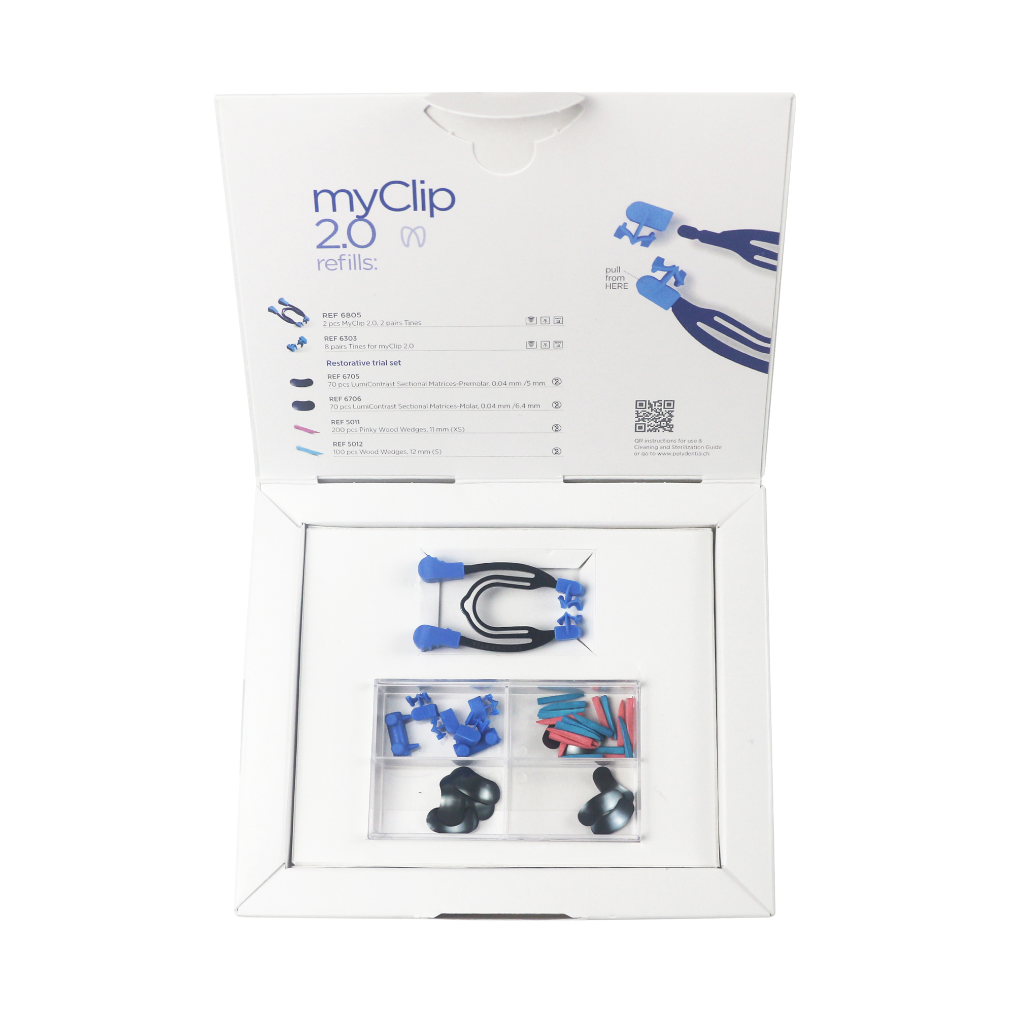 瑞士PL/Polydentia myClip 2.0 成型片夹套装 牙科手术器械包 PL6305,内含:卡环*1 木楔子*20 显微镜用成型片*10 塑料头*4,1套/盒