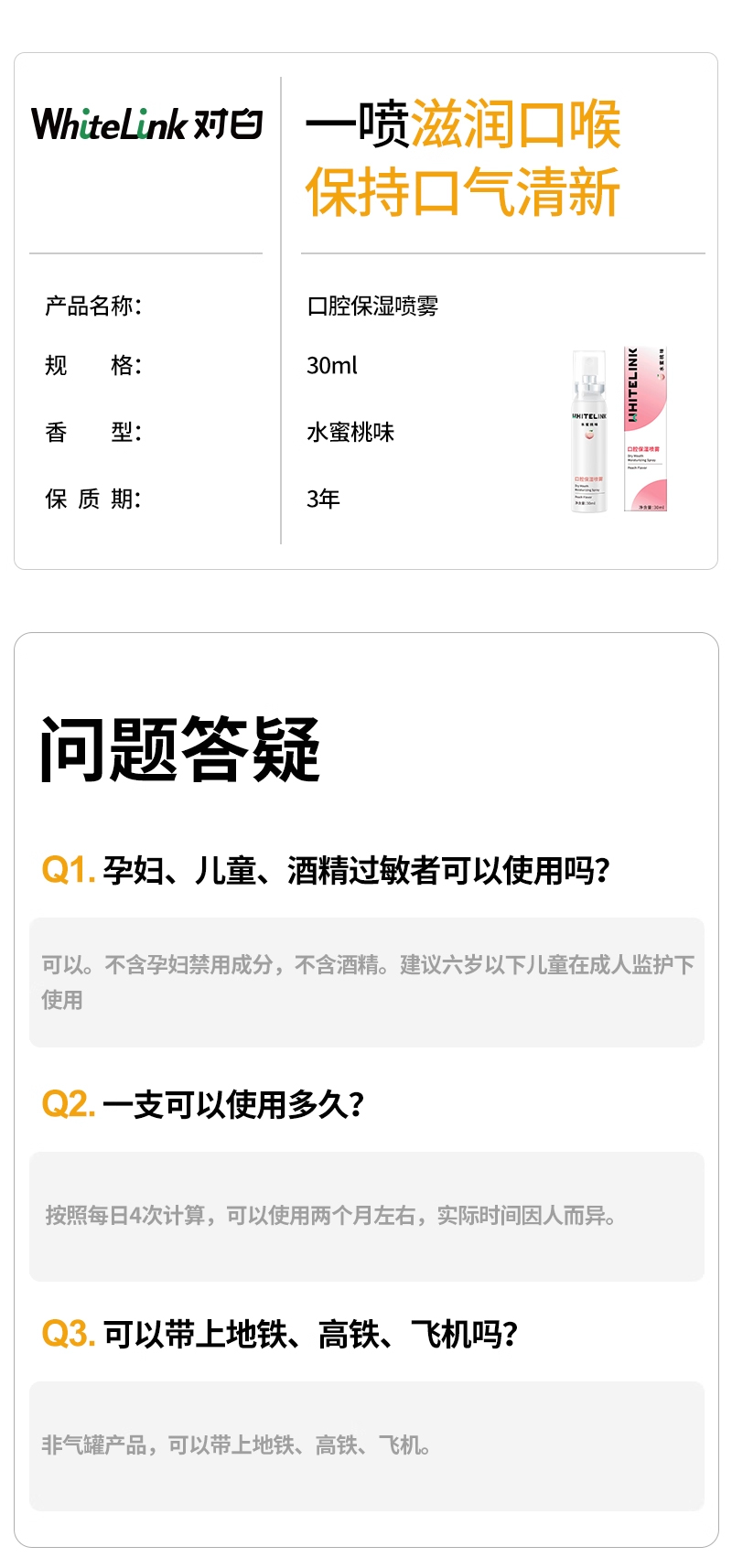 对白/WhiteLink 口腔保湿喷雾 水蜜桃味,30mL/瓶